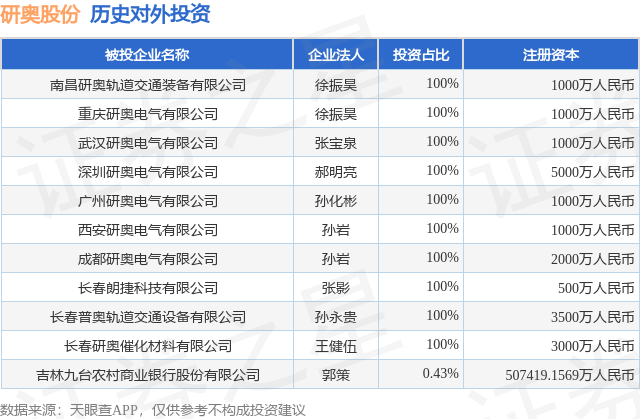 证券之星消息,根据天眼查APP显示,研奥股份(300923.SZ)新增一起对外投资事件,被投资公司为吉林九台农村商业银行股份有限公司,法定代表人郭策,投资占比为0.43%。该公司从事货币金融服务,注册资本为507419.1569万人民币。目前,研奥股份共存在对外投资11项,详见下表: