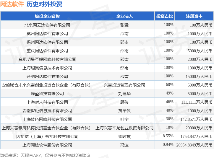 通过天眼查大数据分析,上海网达软件股份有限公司共对外投资了15家企业,参与招投标项目878次;财产线索方面有商标信息14条,专利信息153条,著作权信息205条;此外企业还拥有行政许可1个。据2024年报数据,网达软件长期股权投资3098.43万元,同比减22.49%。