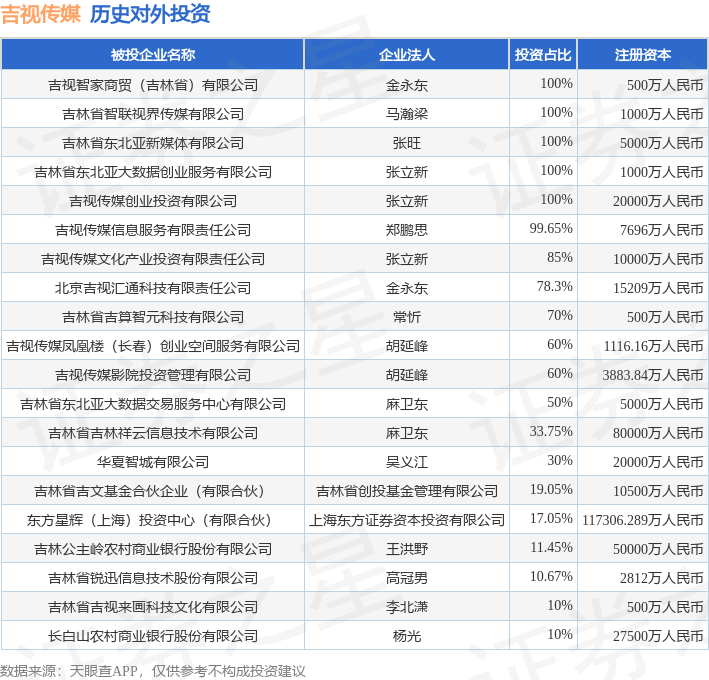 证券之星消息,根据天眼查APP显示,吉视传媒(601929.SH)新增一起对外投资事件,被投资公司为吉林九台农村商业银行股份有限公司,法定代表人郭策,投资占比为1.9%。该公司从事货币金融服务,注册资本为507419.1569万人民币。目前,吉视传媒共存在对外投资29项,投资占比前20的项目见下表: