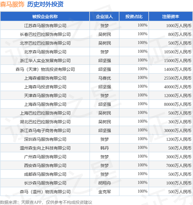 通过天眼查大数据分析,浙江森马服饰股份有限公司共对外投资了45家企业,参与招投标项目151次;财产线索方面有商标信息2670条,专利信息874条,著作权信息650条;此外企业还拥有行政许可25个。据2024年报数据,森马服饰长期股权投资14.23万元,同比增0.2%。