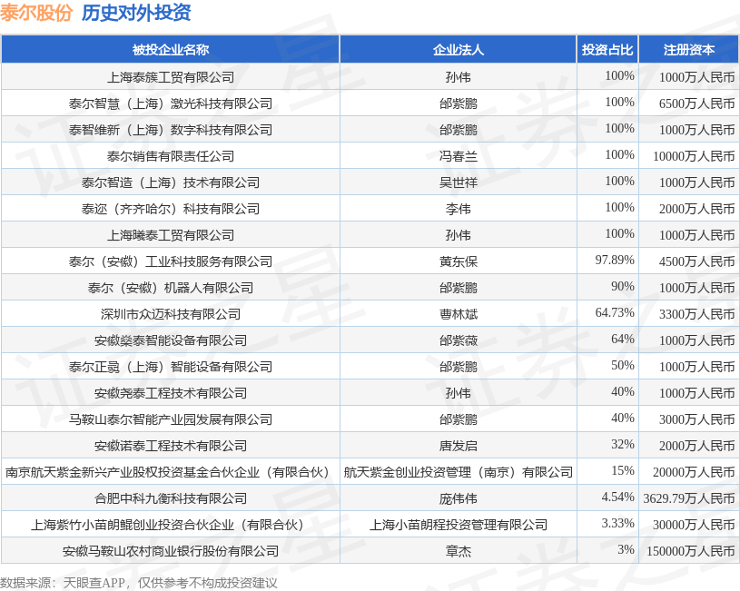 通过天眼查大数据分析,泰尔重工股份有限公司共对外投资了25家企业,参与招投标项目1936次;财产线索方面有商标信息74条,专利信息562条,著作权信息53条;此外企业还拥有行政许可9个。据2024年报数据,泰尔股份长期股权投资4093.24万元,同比增6.82%。