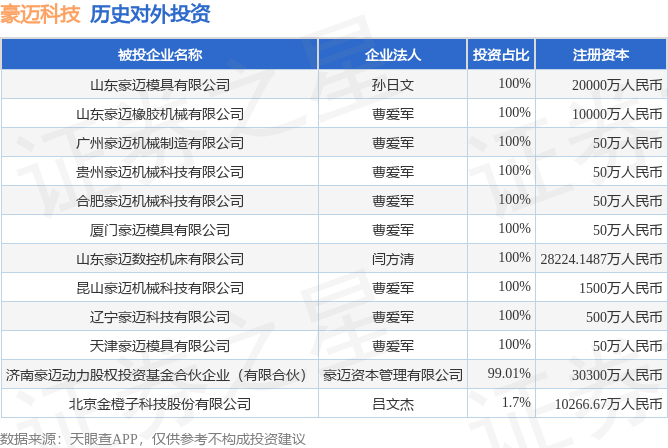 证券之星消息,根据天眼查APP显示,豪迈科技(002595.SZ)新增一起对外投资事件,被投资公司为山东豪迈模具有限公司,法定代表人孙日文,投资占比为100%。该公司从事专用设备制造业,注册资本为20000万人民币。目前,豪迈科技共存在对外投资12项,详见下表: