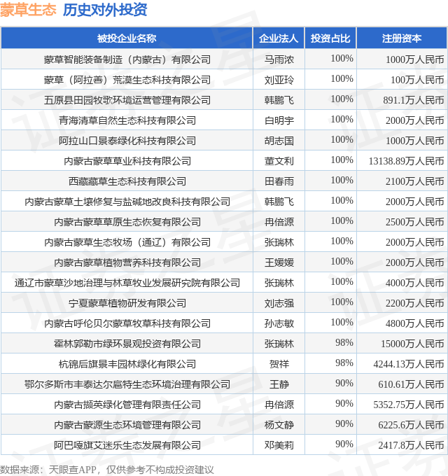 证券之星消息,根据天眼查APP显示,蒙草生态(300355.SZ)新增一起对外投资事件,被投资公司为阿拉善盟铸源矿业有限公司,法定代表人冯青爽,投资占比为30%。该公司从事其他采矿业,注册资本为100万人民币。目前,蒙草生态共存在对外投资78项,投资占比前20的项目见下表: