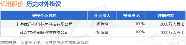证券之星消息,根据天眼查APP显示,优迅股份(688807.SH)新增一起对外投资事件,被投资公司为上海优迅芯创芯片科技有限公司,法定代表人柯腾隆,投资占比为100%。该公司从事研究和试验发展,注册资本为3000万人民币。目前,优迅股份共存在对外投资2项,详见下表: