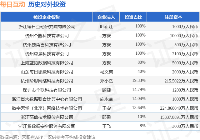 通过天眼查大数据分析,每日互动股份有限公司共对外投资了18家企业,参与招投标项目154次;财产线索方面有商标信息465条,专利信息339条,著作权信息73条;此外企业还拥有行政许可10个。据2024年报数据,每日互动长期股权投资3.62亿元,同比增14.24%。