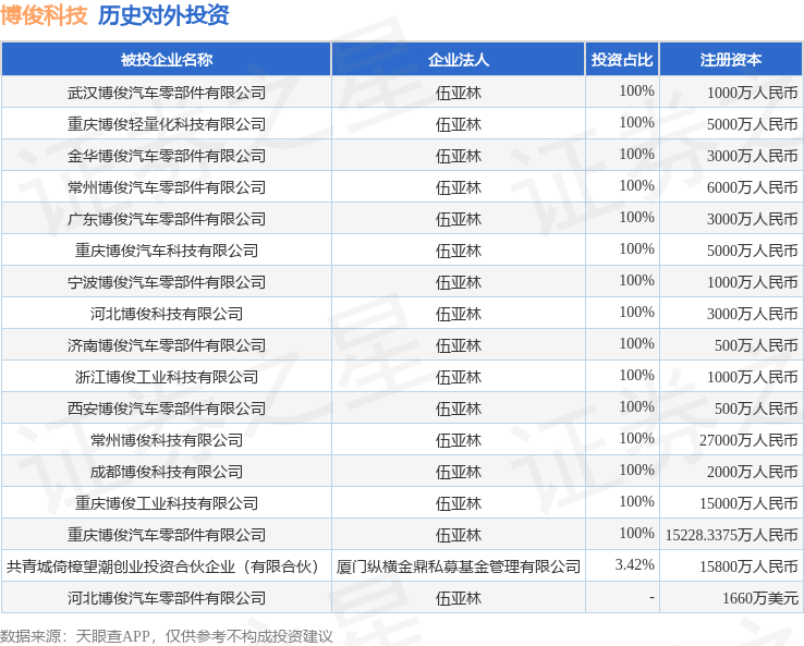 证券之星消息,根据天眼查APP显示,博俊科技(300926.SZ)新增一起对外投资事件,被投资公司为武汉博俊汽车零部件有限公司,法定代表人伍亚林,投资占比为100%。该公司从事汽车制造业,注册资本为1000万人民币。目前,博俊科技共存在对外投资17项,详见下表: