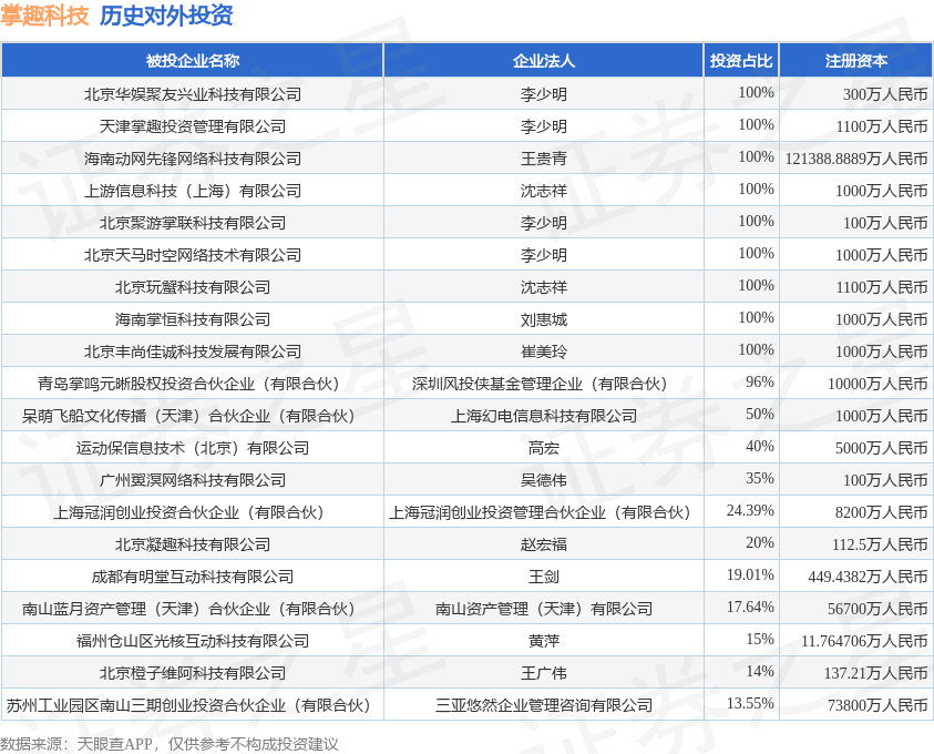 证券之星消息,根据天眼查APP显示,掌趣科技(300315.SZ)新增一起对外投资事件,被投资公司为北京多巴幻境科技有限公司,法定代表人李岩,投资占比为3.69%。该公司从事科技推广和应用服务业,注册资本为103.8314万人民币。目前,掌趣科技共存在对外投资37项,投资占比前20的项目见下表: