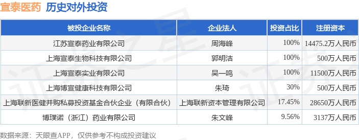 证券之星消息,根据天眼查APP显示,宣泰医药(688247.SH)新增一起对外投资事件,被投资公司为上海联新医健并购私募投资基金合伙企业(有限合伙),法定代表人上海联新资本管理有限公司,投资占比为17.45%。该公司从事资本市场服务,注册资本为28650万人民币。目前,宣泰医药共存在对外投资6项,详见下表: