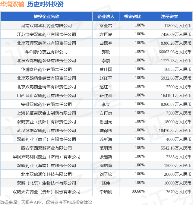 证券之星消息,根据天眼查APP显示,华润双鹤(600062.SH)新增一起对外投资事件,被投资公司为华润双鹤生物医药产业基金投资(呼和浩特)合伙企业(有限合伙),法定代表人,投资占比为16.6%。该公司从事资本市场服务,注册资本为50000万人民币。目前,华润双鹤共存在对外投资31项,投资占比前20的项目见下表: