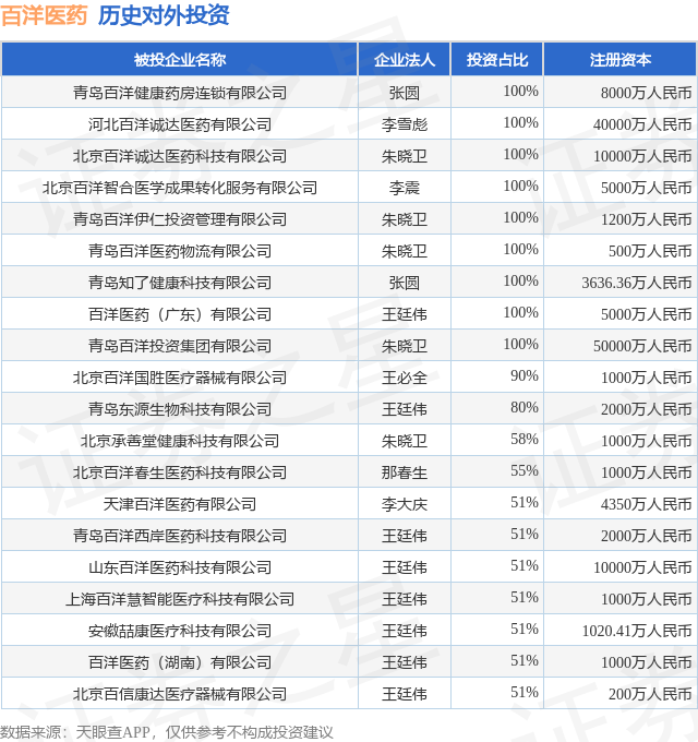 证券之星消息,根据天眼查APP显示,百洋医药(301015.SZ)新增一起对外投资事件,被投资公司为北京百洋春生医药科技有限公司,法定代表人那春生,投资占比为55%。该公司从事研究和试验发展,注册资本为1000万人民币。目前,百洋医药共存在对外投资29项,投资占比前20的项目见下表: