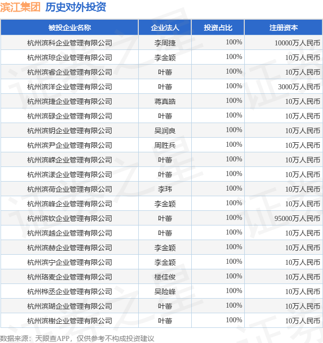 证券之星消息,根据天眼查APP显示,滨江集团(002244.SZ)新增一起对外投资事件,被投资公司为杭州星芮商务咨询有限公司,法定代表人李乃春,投资占比为3.45%。该公司从事商务服务业,注册资本为6960万人民币。目前,滨江集团共存在对外投资346项,投资占比前20的项目见下表:
