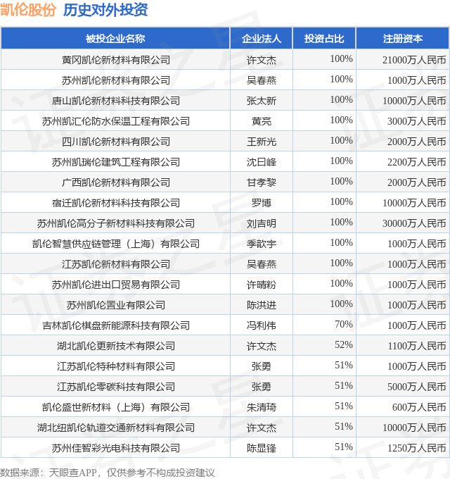 证券之星消息,根据天眼查APP显示,凯伦股份(300715.SZ)新增一起对外投资事件,被投资公司为浙江凯睿新材料有限公司,法定代表人李贵州,投资占比为10%。该公司从事科技推广和应用服务业,注册资本为1000万人民币。目前,凯伦股份共存在对外投资28项,投资占比前20的项目见下表: