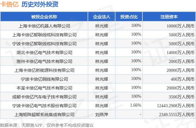 通过天眼查大数据分析,宁波卡倍亿电气技术股份有限公司共对外投资了9家企业,参与招投标项目9次;财产线索方面有商标信息17条,专利信息57条,著作权信息3条;此外企业还拥有行政许可13个。