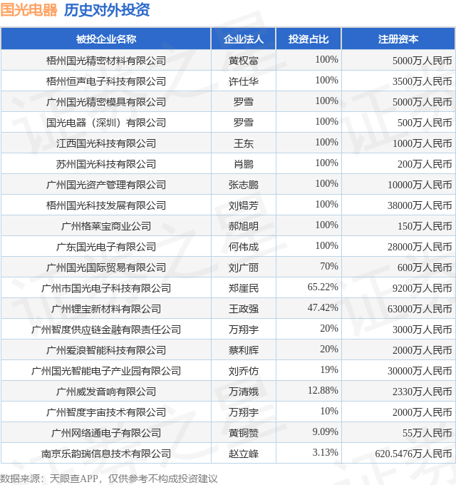 证券之星消息,根据天眼查APP显示,国光电器(002045.SZ)新增一起对外投资事件,被投资公司为梧州国光精密材料有限公司,法定代表人黄权富,投资占比为100%。该公司从事化学原料和化学制品制造业,注册资本为5000万人民币。目前,国光电器共存在对外投资22项,投资占比前20的项目见下表: