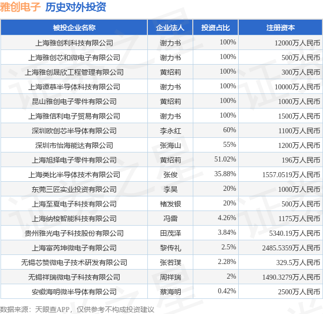 证券之星消息,根据天眼查APP显示,雅创电子(301099.SZ)新增一起对外投资事件,被投资公司为上海雅创利科技有限公司,法定代表人谢力书,投资占比为100%。该公司从事科技推广和应用服务业,注册资本为12000万人民币。目前,雅创电子共存在对外投资18项,详见下表:
