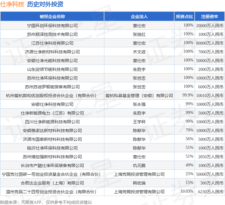 证券之星消息,根据天眼查APP显示,仕净科技(301030.SZ)新增一起对外投资事件,被投资公司为温州隽赢二十四号创业投资合伙企业(有限合伙),法定代表人上海隽赐投资管理有限公司,投资占比为10.03%。该公司从事资本市场服务,注册资本为6230万人民币。目前,仕净科技共存在对外投资22项,投资占比前20的项目见下表: