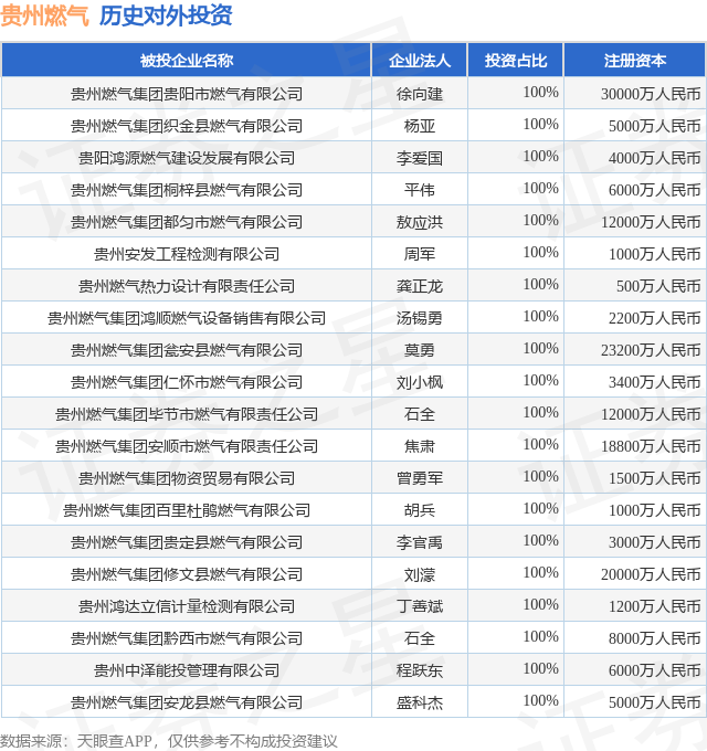 证券之星消息,根据天眼查APP显示,贵州燃气(600903.SH)新增一起对外投资事件,被投资公司为贵州燃气集团贵阳市燃气有限公司,法定代表人徐向建,投资占比为100%。该公司从事燃气生产和供应业,注册资本为30000万人民币。目前,贵州燃气共存在对外投资48项,投资占比前20的项目见下表: