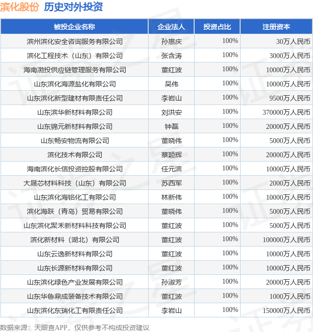 通过天眼查大数据分析,滨化集团股份有限公司共对外投资了41家企业,参与招投标项目393次;财产线索方面有商标信息47条,专利信息127条,著作权信息8条;此外企业还拥有行政许可287个。据2024年报数据,滨化股份商誉4553.78万元,同比未变化。长期股权投资23.36亿元,同比增23.94%。