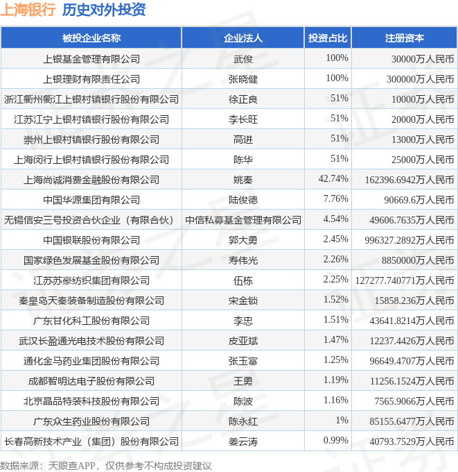 证券之星消息,根据天眼查APP显示,上海银行(601229.SH)新增一起对外投资事件,被投资公司为湖北济川药业股份有限公司,法定代表人曹龙祥,投资占比为0.49%。该公司从事医药制造业,注册资本为92066.066万人民币。目前,上海银行共存在对外投资60项,投资占比前20的项目见下表: