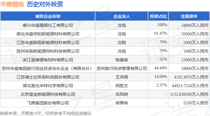 通过天眼查大数据分析,江苏华盛锂电材料股份有限公司共对外投资了11家企业,参与招投标项目68次;财产线索方面有商标信息32条,专利信息116条;此外企业还拥有行政许可96个。据2024年报数据,华盛锂电长期股权投资1.01亿元。