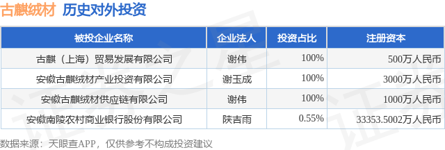 证券之星消息,根据天眼查APP显示,古麒绒材(001390.SZ)新增一起对外投资事件,被投资公司为古麒(上海)贸易发展有限公司,法定代表人谢伟,投资占比为100%。该公司从事批发业,注册资本为500万人民币。目前,古麒绒材共存在对外投资4项,详见下表: