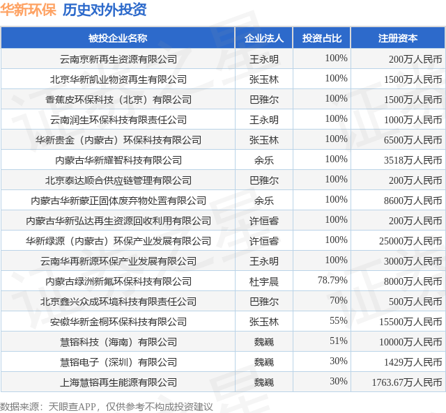 证券之星消息,根据天眼查APP显示,华新环保(301265.SZ)新增一起对外投资事件,被投资公司为上海慧镕再生能源有限公司,法定代表人魏巍,投资占比为30%。该公司从事批发业,注册资本为1763.67万人民币。目前,华新环保共存在对外投资17项,详见下表: