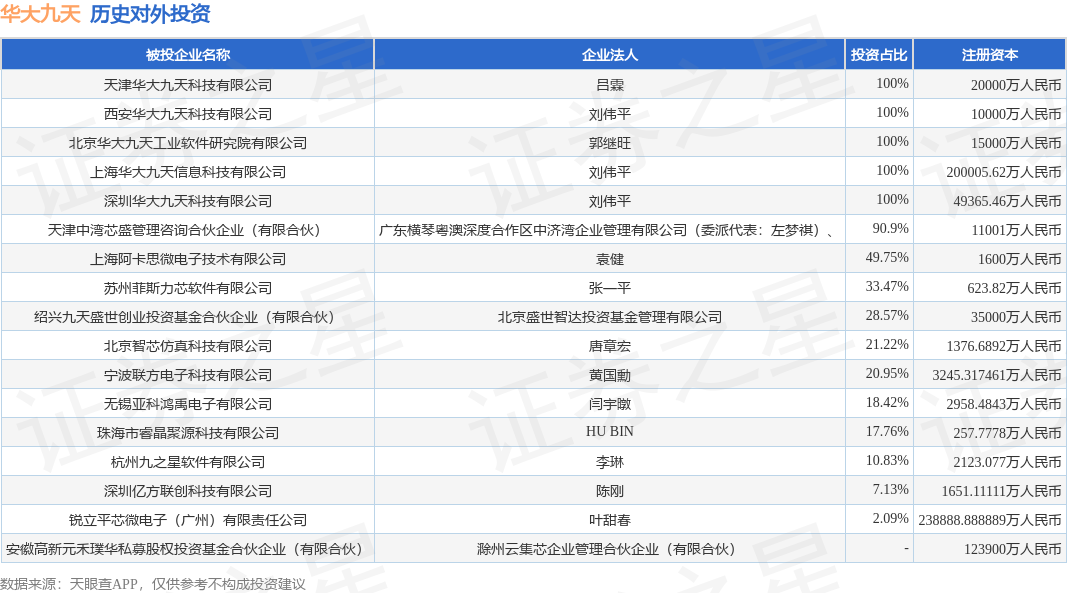 证券之星消息,根据天眼查APP显示,华大九天(301269.SZ)新增一起对外投资事件,被投资公司为天津中湾芯盛管理咨询合伙企业(有限合伙),法定代表人广东横琴粤澳深度合作区中济湾企业管理有限公司(委派代表:左梦祺)、,投资占比为90.9%。该公司从事其他金融业,注册资本为11001万人民币。目前,华大九天共存在对外投资17项,详见下表: