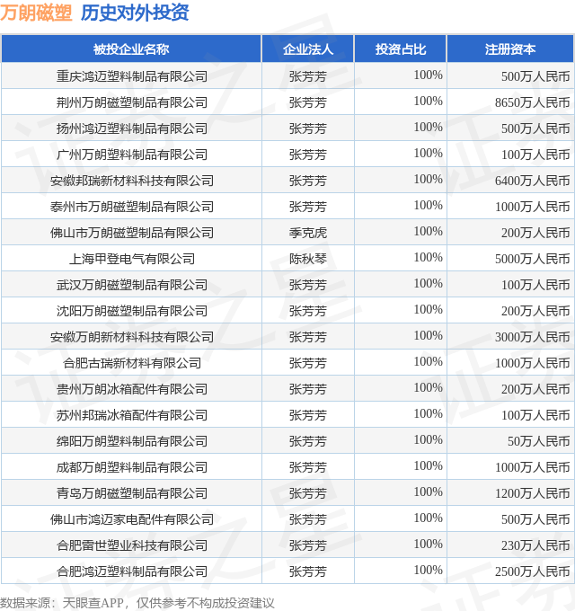 证券之星消息,根据天眼查APP显示,万朗磁塑(603150.SH)新增一起对外投资事件,被投资公司为广东美的智享生活电器制造有限公司,法定代表人陈雨海,投资占比为51%。该公司从事其他制造业,注册资本为20000万人民币。目前,万朗磁塑共存在对外投资58项,投资占比前20的项目见下表: