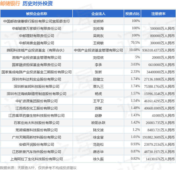 证券之星消息,根据天眼查APP显示,邮储银行(601658.SH)新增一起对外投资事件,被投资公司为中国邮政储蓄银行股份有限公司宜阳县支行,法定代表人史娇娇,投资占比为100%。该公司从事货币金融服务,注册资本为。目前,邮储银行共存在对外投资55项,投资占比前20的项目见下表: