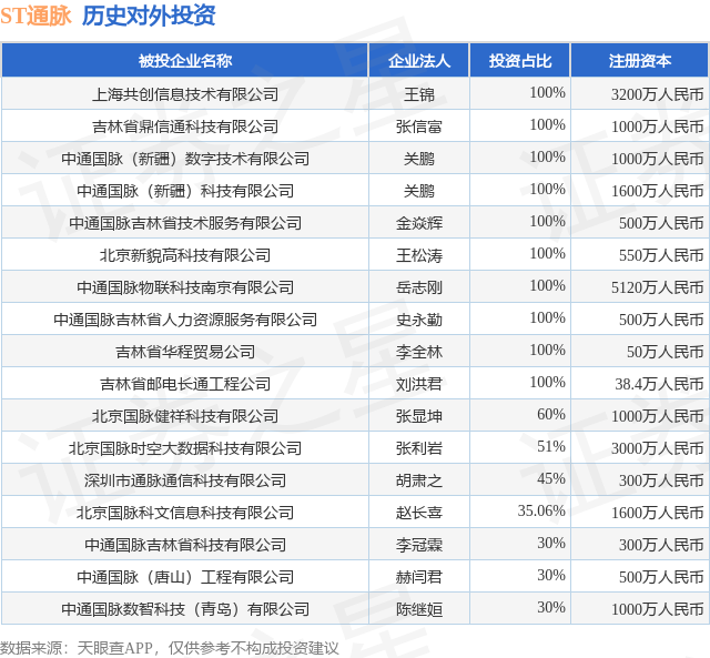 证券之星消息,根据天眼查APP显示,ST通脉(603559.SH)新增一起对外投资事件,被投资公司为深圳市通脉通信科技有限公司,法定代表人胡肃之,投资占比为45%。该公司从事研究和试验发展,注册资本为300万人民币。目前,ST通脉共存在对外投资17项,详见下表: