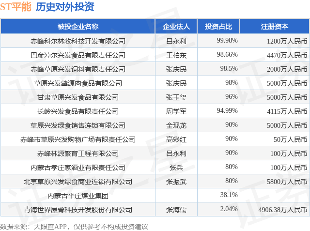 证券之星消息,根据天眼查APP显示,ST平能(000780.SZ)新增一起对外投资事件,被投资公司为草原兴发肇源肉食品有限公司,法定代表人张庆民,投资占比为98%。该公司从事农副食品加工业,注册资本为5000万人民币。目前,ST平能共存在对外投资13项,详见下表:
