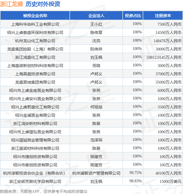 证券之星消息,根据天眼查APP显示,浙江龙盛(600352.SH)新增一起对外投资事件,被投资公司为上海相辉一号创业投资合伙企业(有限合伙),法定代表人上海卿云私募基金管理有限公司,投资占比为-。该公司从事资本市场服务,注册资本为74270万人民币。目前,浙江龙盛共存在对外投资67项,投资占比前20的项目见下表: