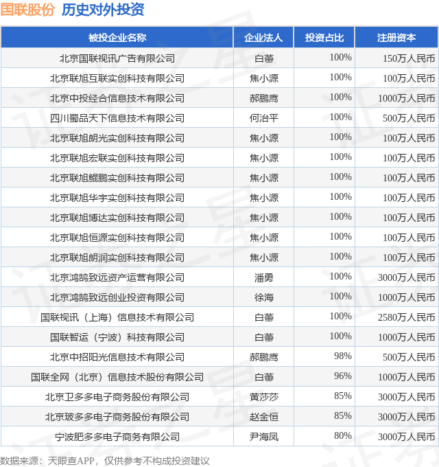 通过天眼查大数据分析,北京国联视讯信息技术股份有限公司共对外投资了45家企业,参与招投标项目30次;财产线索方面有商标信息598条,专利信息144条,著作权信息518条;此外企业还拥有行政许可33个。据2024年报数据,国联股份长期股权投资1.59亿元,同比增29.68%。