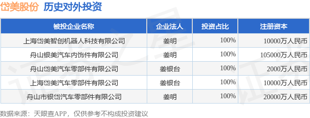 证券之星消息,根据天眼查APP显示,岱美股份(603730.SH)新增一起对外投资事件,被投资公司为上海岱美智创机器人科技有限公司,法定代表人姜明,投资占比为100%。该公司从事计算机、通信和其他电子设备制造业,注册资本为10000万人民币。目前,岱美股份共存在对外投资5项,详见下表:
