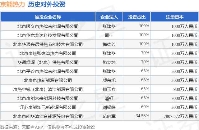 证券之星消息,根据天眼查APP显示,京能热力(002893.SZ)新增一起对外投资事件,被投资公司为北京顺义京热综合能源有限公司,法定代表人张建华,投资占比为100%。该公司从事电力、热力生产和供应业,注册资本为1000万人民币。目前,京能热力共存在对外投资11项,详见下表: