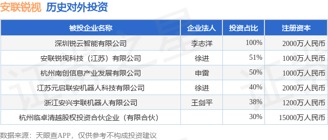 证券之星消息,根据天眼查APP显示,安联锐视(301042.SZ)新增一起对外投资事件,被投资公司为江苏元启联安机器人科技有限公司,法定代表人徐进,投资占比为40%。该公司从事计算机、通信和其他电子设备制造业,注册资本为2000万人民币。目前,安联锐视共存在对外投资6项,详见下表:
