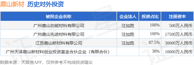 证券之星消息,根据天眼查APP显示,鹿山新材(603051.SH)新增一起对外投资事件,被投资公司为广州天泽鹿山新材料创业投资基金合伙企业(有限合伙),法定代表人,投资占比为30%。该公司从事资本市场服务,注册资本为10000万人民币。目前,鹿山新材共存在对外投资4项,详见下表:
