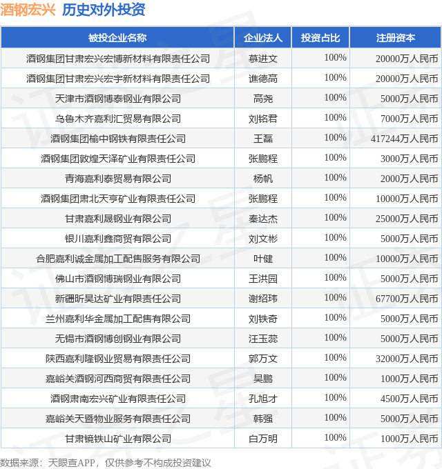 证券之星消息,根据天眼查APP显示,酒钢宏兴(600307.SH)新增一起对外投资事件,被投资公司为酒钢集团甘肃宏兴宏博新材料有限责任公司,法定代表人慕进文,投资占比为100%。该公司从事黑色金属冶炼和压延加工业,注册资本为20000万人民币。目前,酒钢宏兴共存在对外投资25项,投资占比前20的项目见下表: