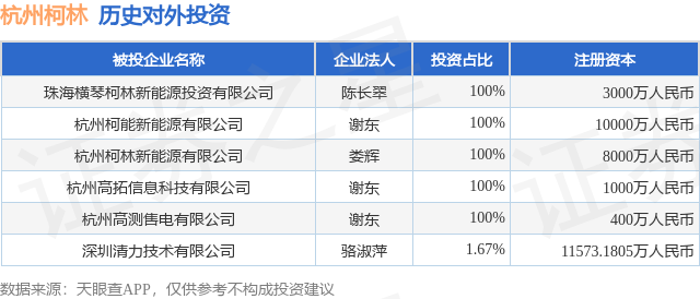 证券之星消息,根据天眼查APP显示,杭州柯林(688611.SH)新增一起对外投资事件,被投资公司为深圳清力技术有限公司,法定代表人骆淑萍,投资占比为1.67%。该公司从事专业技术服务业,注册资本为11573.1805万人民币。目前,杭州柯林共存在对外投资6项,详见下表: