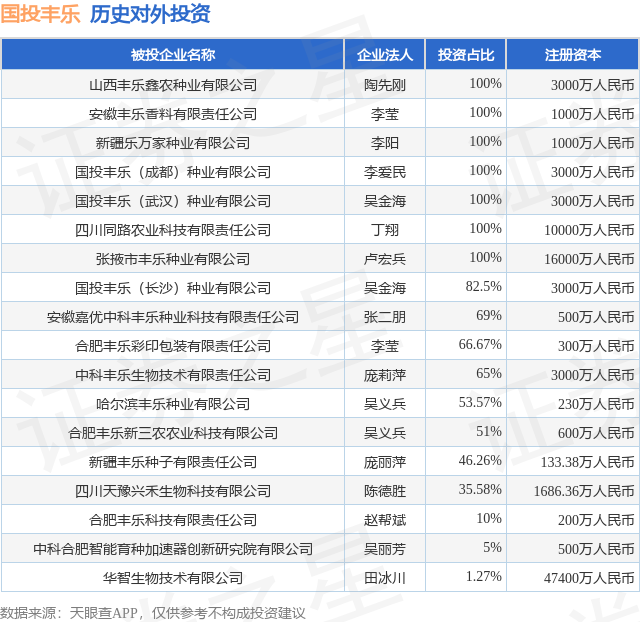 证券之星消息,根据天眼查APP显示,国投丰乐(000713.SZ)新增一起对外投资事件,被投资公司为山西丰乐鑫农种业有限公司,法定代表人陶先刚,投资占比为100%。该公司从事农业,注册资本为3000万人民币。目前,国投丰乐共存在对外投资18项,详见下表: