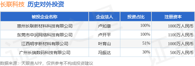 证券之星消息,根据天眼查APP显示,长联科技(301618.SZ)新增一起对外投资事件,被投资公司为江西明宇新材料有限公司,法定代表人叶育山,投资占比为51%。该公司从事橡胶和塑料制品业,注册资本为1000万人民币。目前,长联科技共存在对外投资4项,详见下表: