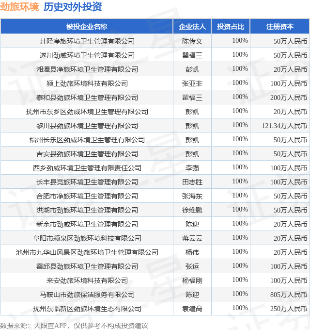 证券之星消息,根据天眼查APP显示,劲旅环境(001230.SZ)新增一起对外投资事件,被投资公司为井陉净旅环境卫生管理有限公司,法定代表人陈传义,投资占比为100%。该公司从事公共设施管理业,注册资本为50万人民币。目前,劲旅环境共存在对外投资101项,投资占比前20的项目见下表: