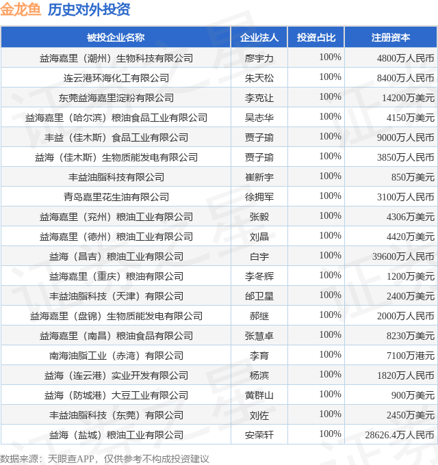 证券之星消息,根据天眼查APP显示,金龙鱼(300999.SZ)新增一起对外投资事件,被投资公司为益海嘉里(潮州)生物科技有限公司,法定代表人廖宇力,投资占比为100%。该公司从事农副食品加工业,注册资本为4800万人民币。目前,金龙鱼共存在对外投资222项,投资占比前20的项目见下表: