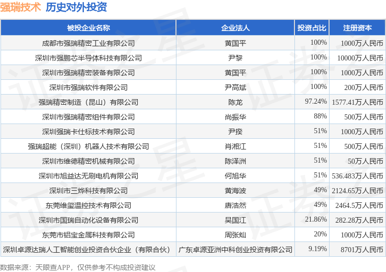 证券之星消息,根据天眼查APP显示,强瑞技术(301128.SZ)新增一起对外投资事件,被投资公司为成都市强瑞精密工业有限公司,法定代表人黄国平,投资占比为100%。该公司从事汽车制造业,注册资本为1000万人民币。目前,强瑞技术共存在对外投资15项,详见下表: