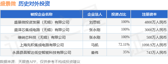 证券之星消息,根据天眼查APP显示,盛景微(603375.SH)新增一起对外投资事件,被投资公司为永昌县昌智达低空智能科技有限公司,法定代表人姜伟,投资占比为35%。该公司从事互联网和相关服务,注册资本为743万人民币。目前,盛景微共存在对外投资5项,详见下表: