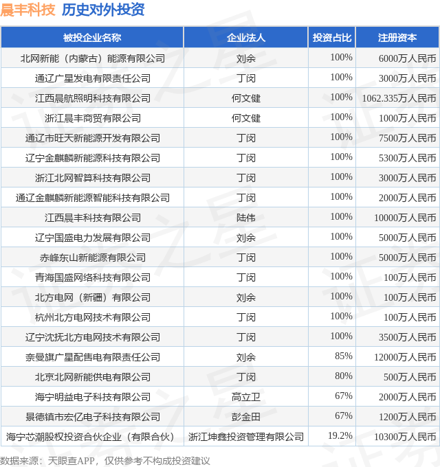 证券之星消息,根据天眼查APP显示,晨丰科技(603685.SH)新增一起对外投资事件,被投资公司为北网新能(内蒙古)能源有限公司,法定代表人刘余,投资占比为100%。该公司从事电力、热力生产和供应业,注册资本为6000万人民币。目前,晨丰科技共存在对外投资21项,投资占比前20的项目见下表: