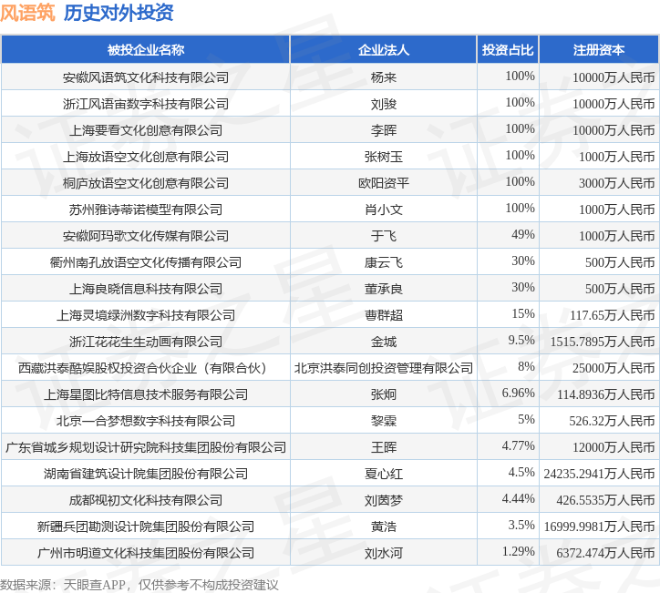 证券之星消息,根据天眼查APP显示,风语筑(603466.SH)新增一起对外投资事件,被投资公司为安徽风语筑文化科技有限公司,法定代表人杨来,投资占比为100%。该公司从事文化艺术业,注册资本为10000万人民币。目前,风语筑共存在对外投资19项,详见下表: