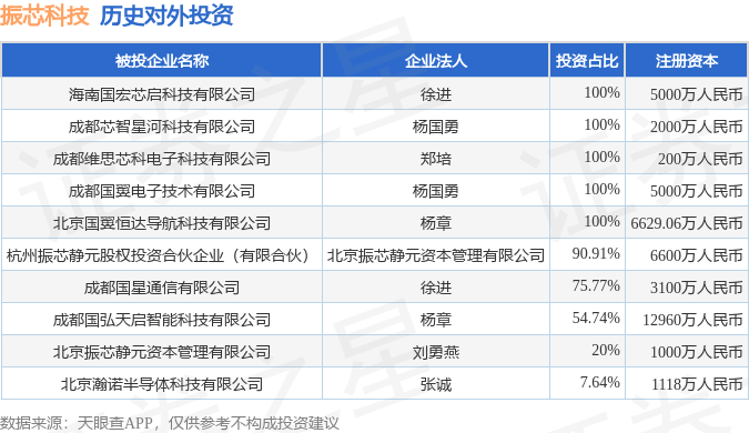 证券之星消息,根据天眼查APP显示,振芯科技(300101.SZ)新增一起对外投资事件,被投资公司为海南国宏芯启科技有限公司,法定代表人徐进,投资占比为100%。该公司从事计算机、通信和其他电子设备制造业,注册资本为5000万人民币。目前,振芯科技共存在对外投资10项,详见下表: