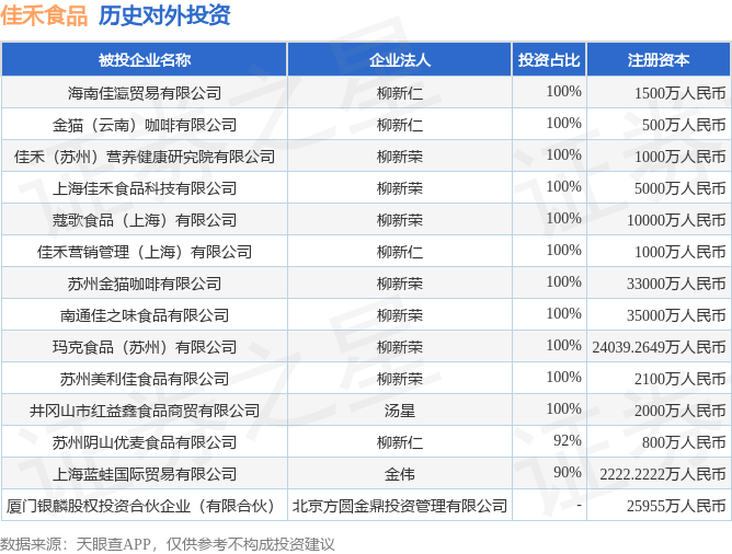 证券之星消息,根据天眼查APP显示,佳禾食品(605300.SH)新增一起对外投资事件,被投资公司为海南佳瀛贸易有限公司,法定代表人柳新仁,投资占比为100%。该公司从事批发业,注册资本为1500万人民币。目前,佳禾食品共存在对外投资14项,详见下表:
