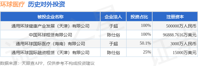 证券之星消息,根据天眼查APP显示,环球医疗(02666.HK)新增一起对外投资事件,被投资公司为通用环球国际医疗(海南)有限公司,法定代表人于超,投资占比为50.1%。该公司从事卫生,注册资本为3000万人民币。目前,环球医疗共存在对外投资4项,详见下表: